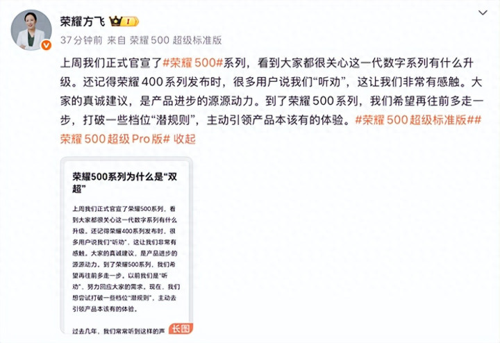 方飞在微博解答了超级标准版背后的产品逻辑与设计初心,她提到,长久以来,由于产品定位,标准版手机在消费者心中往往意味着功能的妥协。荣耀500标准版的目标,正是打破这一刻板印象,做一台“一步到位”的手机,让用户在合理的预算内,获得媲美档位Pro级别的体验。